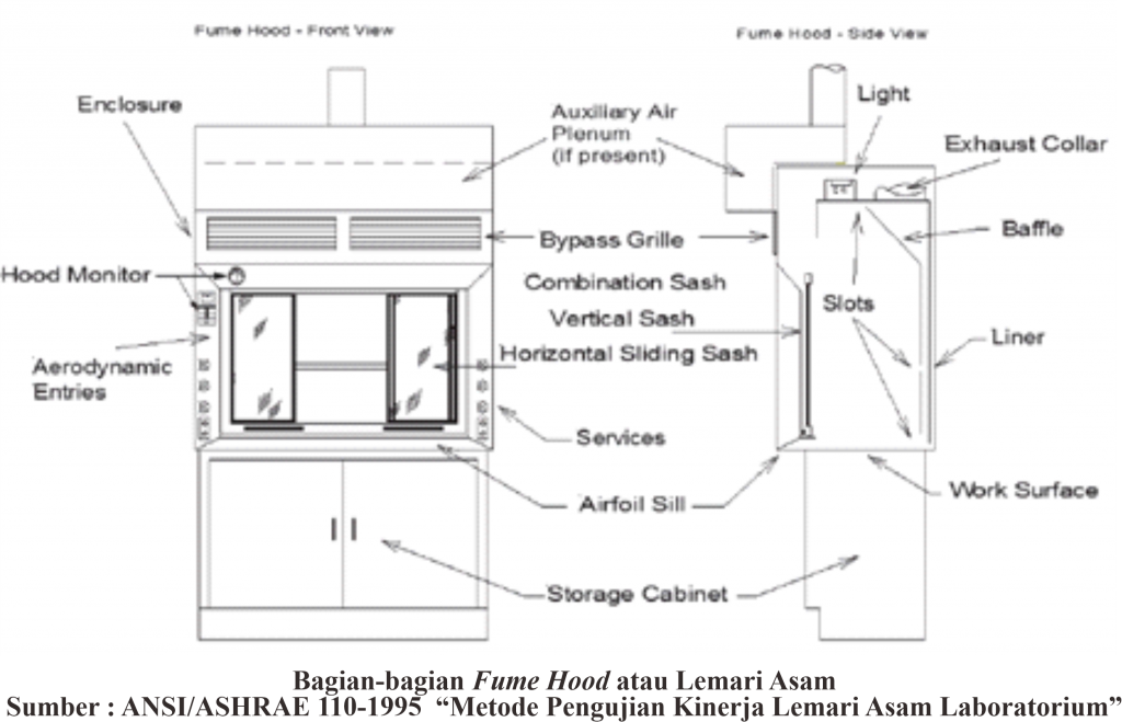 Fume hood terdiri atas beberapa bagian yaitu fume hood body, baffles, sash door, airfoil, meja kerja, dan juga exhaust.
